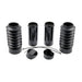 Gloss black powder coated CNC machined aluminum covers. Covers the full front fork from bottom to top of the upper triple tree. Includes aluminum fork tube caps, upper fork covers and genuine black rubber (bobber boots) lower fork covers for a touch of retro. Transforms the complete front end to a massive Black-Out muscle bike look. Compatible with stock and custom fenders. Installs with set-screws. All required hardware is included.18-21 Softail FXBR/S Breakout