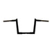 Satin black powder coated finish. Dimpled and drilled for internal wiring. With smooth inside corners to prevent wiring damage and ease in wiring pull-through. Works with or without e-throttle. Approx. dimensions: 10" rise x 6" wide x 9" pullback x 14" center width and a 37° wrist angle. Note: Fits models with 1" diameter riser clamp area only.82-21 H-D mech & e-throttle (excl. 88-11 Springers; 82-21 Touring) with 1" I.D. risers