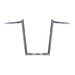Chrome plated finish. Dimpled and drilled for internal wiring. With smooth inside corners to prevent wiring damage and ease in wiring pull-through. Works with or without e-throttle. Approx. dimensions: 16" rise x 6" wide x 9" pullback x 14" center width and a 37° wrist angle. Note: Fits models with 1" diameter riser clamp area only.