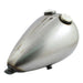2.2 gallon (8.3 liter). Small custom fuel tank. Tank comes with internal thread, 3/8" (right side) and 1/4" thread (left side). Takes pre-83 bajonet style gas caps. Approx. dimensions: 17" (43cm) long x 9" (23cm) wide with a 3" (7.6cm) deep tunnel. Note: When using a 3/8" petcock, the 1/4" hole must be sealed with a plug. This 1/4" plug is not included and must be purchased separately. Note: It is advised to pressure test, seal and test fit all tanks before tanks are painted and installed. Some tanks are painted, but this coat is applied for rust prevention during storage only.Universal